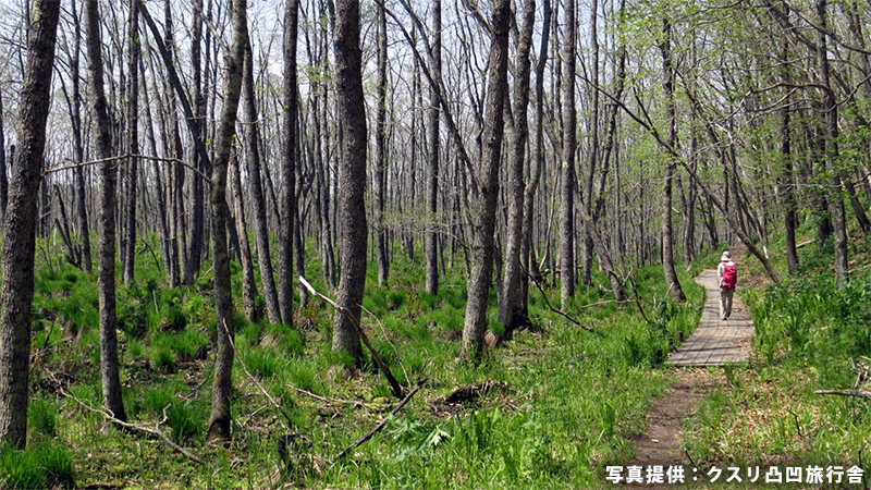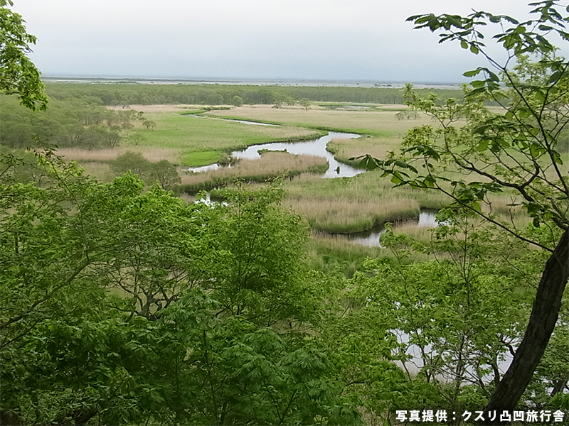 今回は、釧路駅から阿寒バスの鶴居線に乗り、釧路湿原を目指します。釧路湿原は、北海道東部を流れる釧路川とその支流を抱く日本最大の湿原。全域とその周囲の丘陵地帯は、国立公園に指定されています。今の時期はちょうど芽吹きを終え、新緑が美しい時期です。北海道には梅雨がないため、訪れるならこの時期がベストタイミングかもしれません。バスに揺られること30分ほど。湿原展望台でバスを降りると、ガイドをお願いしたクスリ凸凹旅行舎の塩博文さんが待っていてくれました。今日歩くのは釧路市湿原展望台から出発して、低層湿原、高層湿原など湿原の魅力を満喫できる6キロほどのコースです。