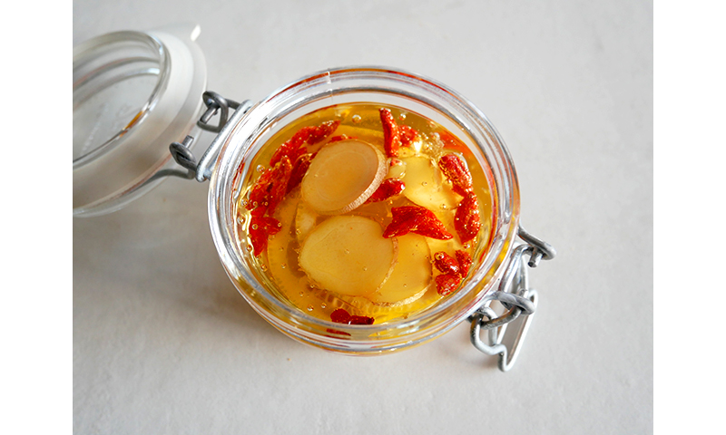 2. 保存瓶にレモンと生姜のスライス、クコの実、はちみつを入れ、2〜3日冷蔵庫で漬け込む。