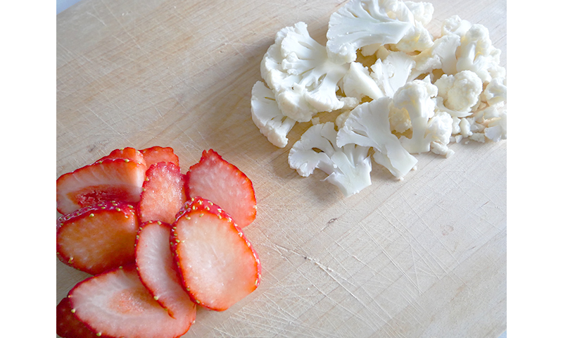 1. いちごはヘタを落として縦に4等分に切る。カリフラワーは房取りし2?幅の薄切りにする。
