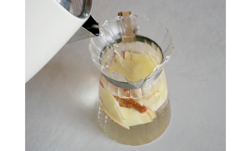 3. ティーポットに茶葉(ティーバッグ)、りんごのスライス、シナモンスティックを入れ、お湯を注ぐ。