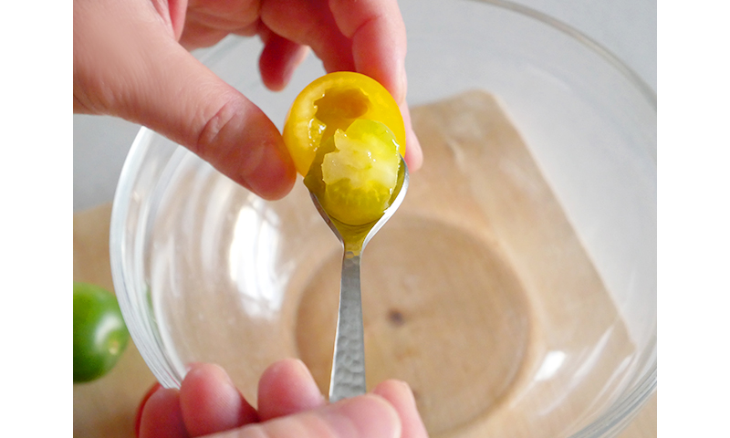 2. プチトマトの中をくり抜き、水分を取り除く。