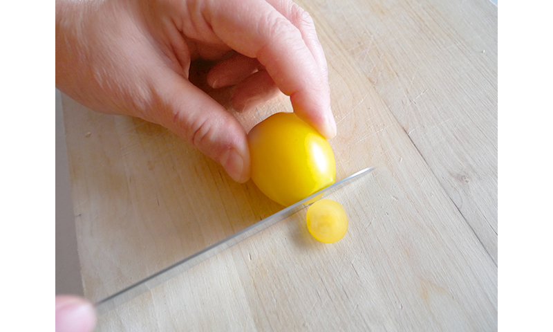 1. プチトマトの下はお皿に置いたときに安定性をよくするために2ミリほどカット。上は飾りと中身を取り出すため5ミリほどカットします。
