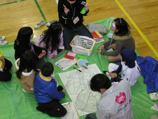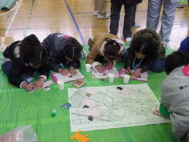 フィールドワークを終えて小学校へ戻り、班ごとに持ち帰った写真・地図を元に、地域安全マップを作りました。