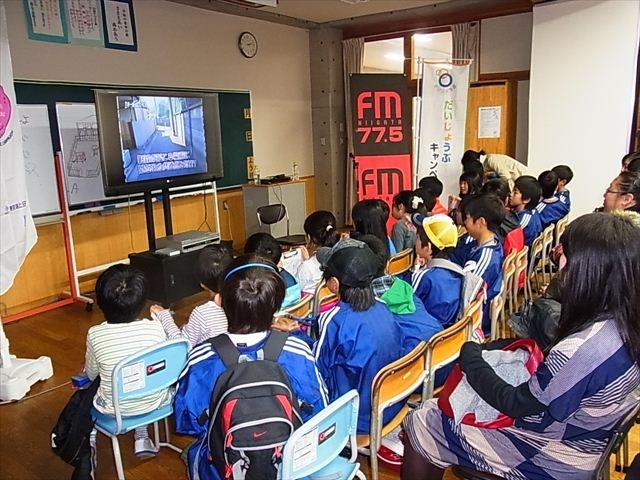 この日の参加者には低学年の児童も多く、また雨だけでなく気温も低いことから急遽プログラムを変更。児童達と東京海上日動の代理店・社員の皆さんは教室に残り、映像を見ながら「入りやすい」「見えにくい」場所を学ぶことになりました。