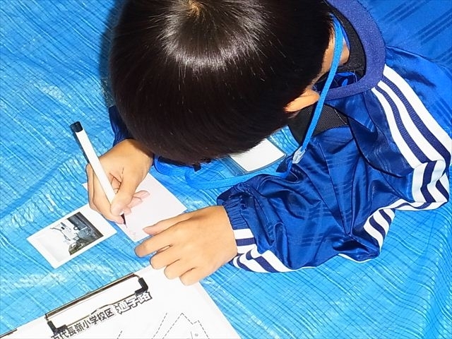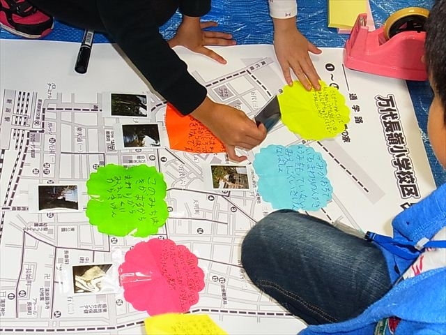 ここからは、雨の中大急ぎで撮影した写真を使って、児童達が大きな白地図に地域安全マップを書き込んで行きます。