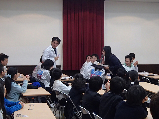 英語を織り交ぜた楽しい挨拶でこれまで緊張していた児童たちも皆リラックスした後、「海外に行っても、今日の講義は通用するんだよ」と小宮教授からの説明に続き、やさしく解りやすく、面白い講義が展開されていきます。