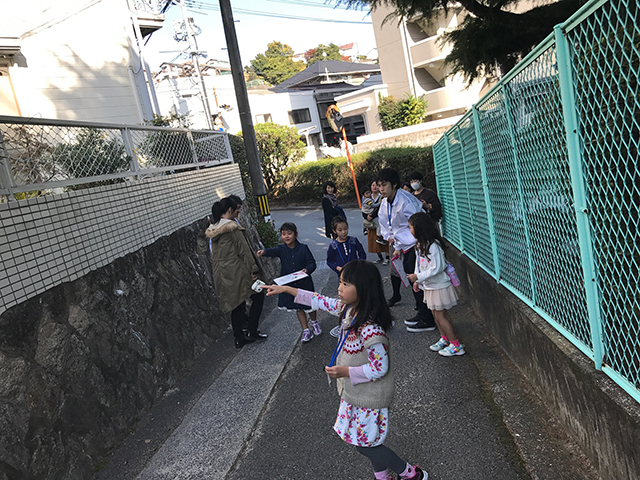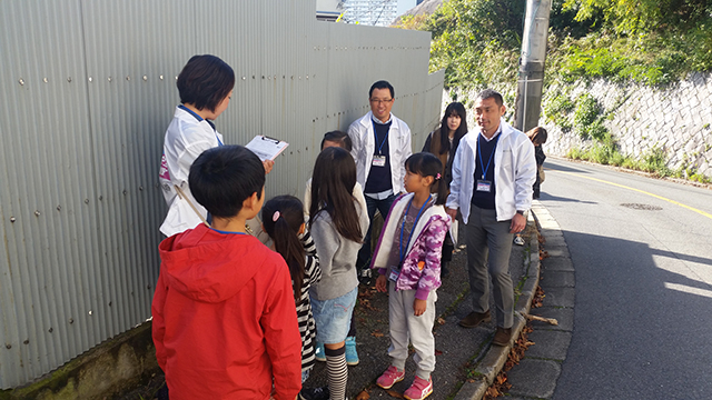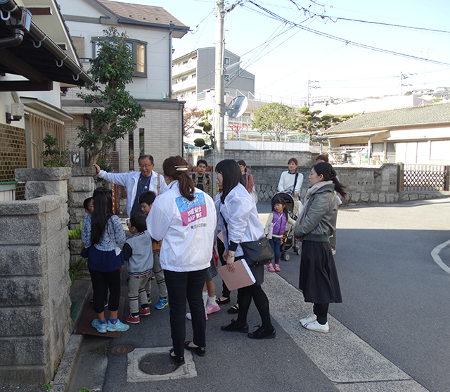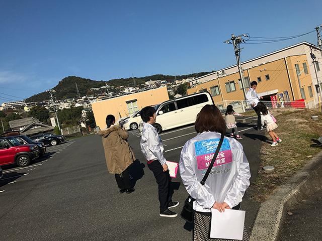 午前中にフィールドワークで周った場所を児童たちと一緒に周っていると「ここ危ないよ」、「この場所見えにくい」など、児童たちが積極的に指導の方に教えてあげる姿が見受けられ、先程の授業が実践でもすぐに発揮できる児童たちの得意げな顔が印象的でした。