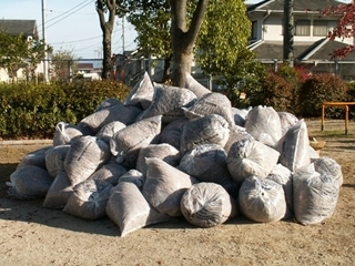 あっという間に公園中の落ち葉を集めきって、ゴミ袋の山に!