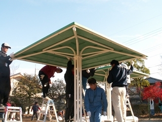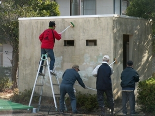 ベンチ屋根のポールにペンキを塗ります。