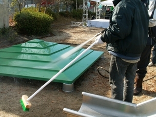 枯れ葉などのゴミを砂場から取り除いてから洗浄剤を使って殺菌します。
