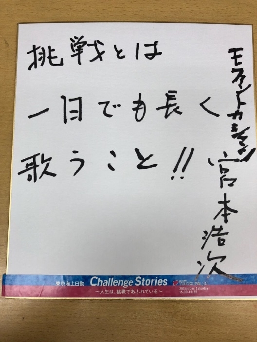 番組では、そんな宮本さんの挑戦に関するメッセージを色紙に書いて頂きました!こちらの色紙を1名様にプレゼントします。このホームページ右のメッセージフォームから「宮本浩次さんの色紙希望」と書いてご応募ください!