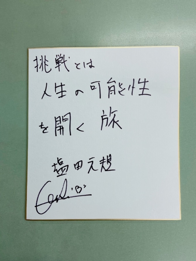 番組では、そんな塩田さんの挑戦に関するメッセージを色紙に書いて頂きました!こちらを1名様にプレゼントします。このホームページのメッセージフォームから「塩田元規さんの色紙希望」と書いてご応募ください!