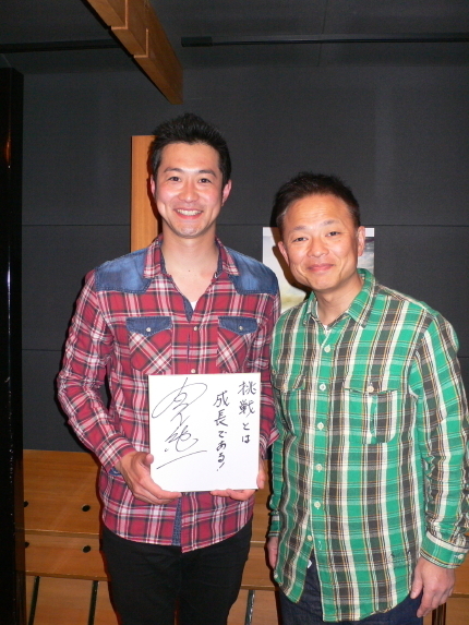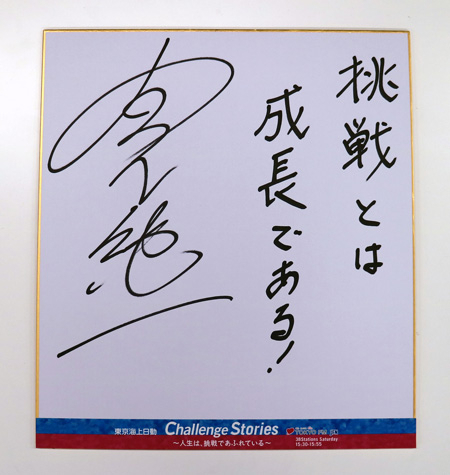 そして、宮下さんから挑戦に関する一言メッセージを色紙に頂きました。「挑戦とは成長である」まさに挑戦を繰り返し成長してきた宮下さんの根底にある言葉です。番組では、こちらの色紙を1名様にプレゼントします!ホームページのメッセージフォームからご応募ください。