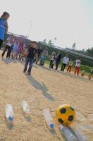 拾ったペットボトルを10個立てて、サッカーボールを蹴って倒す、