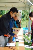 エフエム山口のパーソナリティーが、普段は見せない真剣な眼差しで受付業務をこなしています(奥:BB金光・手前:鈴木晶久):大人に混じって小学生が頑張っていました。