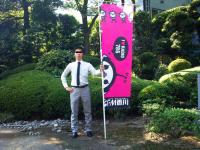 ちょっと走れば右に父母ケ浜が見えてきて、その先が駐車場になります。入り口がわかりにくいので、こんな幟を立ててスタッフを配置しておきます。現場の指示に従ってくださいね。