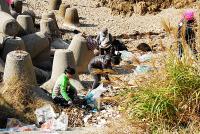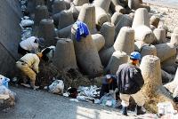 Dブロックとは、上の写真の遠くに見える「島」のような岩の向こう側です。ここにはテトラポットが置かれているため漂着ごみが引っかかって残ってしまったり、なによりここから先はしばらく民家がないため「不法投棄」の格好の現場になっているのです。