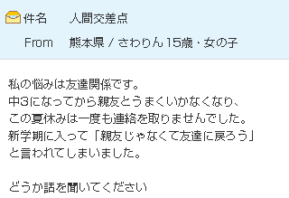 まずは小部屋に案内する前に、RYO-Z先生と挨拶です。 RYO-Z_RIP SLYMEのRYO-Zです! さわりん_熊本県のさわりんです! RYO-Z_また、スゴイこと言われたね〜。 さわりん_はい。 RYO-Z_しかも最近だよね? さわりん_はい、新学期が始まってすぐです。 RYO-Z_オレ、こんなパンチライン喰らったことないわ。 さわりん_あ、はい。 RYO-Z_じゃあ、SU先生が待つ小部屋へ、どうぞ。 さわりん_はい。失礼します!! (小部屋のドアをガラガラ・・・) ![]() さわりん_こんばんは。よろしくお願いします。 SU_えーっと、親友とはいつから仲が良いの? さわりん_小学校5年生ぐらいです。 SU_じゃあ、かれこれ5年くらい経つんだね。 さわりん_そうです。 SU_“アタシたち親友だよねー”って言い合うものなの? さわりん_言い合ってました。 SU_突然・・・“友達に戻ろう”って言われちゃった? さわりん_はい。すごく悲しくて、泣きました。 SU_何か理由とかあったのー? さわりん_お互い仲のいい友達ができたんですよ。 SU_へー。女の子の友達? さわりん_はい。それで嫉妬してケンカになったんです。 SU_どんなケンカになったの? さわりん_言葉の無いケンカ・・・です。 SU_あららら。 さわりん_お互い距離を取るようになって。 SU_“あのコと仲良くしちゃヤダ”って言わなかったの? さわりん_言いました。“私とも遊んで”って。 SU_そしたら? さわりん_“あー、ごめんごめん”って。 SU_そうなんだ・・・。 さわりん_だけど、そのままでした。 SU_これはさぁ、女心だよねぇ。男にはね、 さわりん_はい。 SU_“オレたち親友だよな”っていうのが無いのね。 さわりん_あー、そうなんですか。 SU_だから、すごく不思議だなーってね。 さわりん_はい。 SU_「友達」と「親友」の境目って何? さわりん_友達だと素の自分でいられないっていうか。 SU_あぁ、なるほど〜。 さわりん_親友だとそのままの自分でいられます。 SU_さわりんは、親友に戻りたいの? さわりん_んー・・・普通にしゃべっていきたいです。 SU_じゃあ、友達でいいんだ? さわりん_これ以上、親友を悩ませたくなくて・・・ ![]() 「さわりんがその親友を悩ませたくないっていう気持ちなら、それでいいと思うんですよね。しばらく友達でいて、でも、もしかしたらまた仲良くなる日が来るかもしれないでしょう。 だから今は、さわりんが大人になって、ゆったりとその日を待つのもいいんじゃないでしょうか。2人が歩んできた5年間の月日はそんな軽々しいもんじゃないと思うからね」 SU先生に続いて、 小部屋の外で待っていたRYO-Z先生からもアドバイス。 「オレは“親友”って言われると、思い浮かぶヤツが1人いるんだけど、そいつは小学校から知ってるヤツで。今は海外に行ってて、ここ何年も会ってないんだけど、結婚式には遠路はるばるやって来てくれて。向こうが結婚したら会いに行こうと思うしね。 こう・・・会わなくても続いていくのが“友情”なのかなって思うんだ。そういう気持ちがお互いの心にあれば、いったん離れた距離が近づくことは、あるんじゃないかと思うよ」 ![]() ![]() RIP SLYME「Tales」。 この曲の中のSU先生がこう言ってます。 “あの人どこかで見てるはずで 心でつながっているはずで この大空で・・・” さわりんとの話が終わったあとも、SU先生とRYO-Z先生は、まだ教室で話しています。相手に望むことも大事だけど、さわりん自身の気持ちも大事。相手を思う気持ちさえあれば、以前のような関係に戻れるはず。そのときをゆっくりと待ちましょう。 ![]() M-1 ZOCK ON!×Material Girl - DJ FUMIYA EDIT / TERIYAKI BOYZ VS. MADONNA M-2 Tales /RIP SLYME |