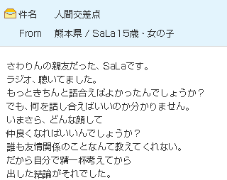 ![]() アンサーメール。 ある曲の内容に対して、返答する曲を作ることを "アンサーソング" と言いますが、前回のさわりんの授業を聴いていたSaLaからの返答メール・・・、まさにアンサーメールです。 なんと電話が繋がっちゃいました!!! RYO-Z_もしもーし! RIP SLYMEのRYO-Zです! SU_SUです! SaLa_熊本県のSaLaです! SU_まずはメールくれてありがとね。 SaLa_いえいえ。 SU_なかなかね、できることじゃないですよ。 SaLa_あ、はい・・・ (照) RYO-Z_こないだの放送、聴いてくれてたんだ? SaLa_はい、聴いてました。 RYO-Z_そっかー。 ![]() 実は、SU先生。前回、さわりんと話した後も、ずっとあのフレーズについて考えていたそう。 「僕ね、あれから何週間か考えたんですよ。"親友から友達に戻ろう" って言葉について・・・。で、結論は、"あの言葉を言って良かった" ってなったんだよね。だって、普通は言わないでシカトしたりするワケでしょう・・・? その方が悪いもん」 放送を聴いていたSaLaは、こう思ったそうです。 「私的には、"親友じゃなくて友達に戻ろう" っていう言葉が、そんなにヒドい言葉だと思わなくて・・・」 SU_いや、ヒドい言葉じゃないよ。 RYO-Z_あっ、うんうん!! SU_オレたちの言い方が悪かったね、ごめんね。 SaLa_いや、全然・・・ (汗) RYO-Z_ちなみに周りの友達はさ、 SaLa_はい。 RYO-Z_"親友じゃなくて友達に戻ろう"って言うの? SaLa_・・・言わないですね。 SU_言わずに距離が離れていくってことだよね? SaLa_そうです。 RYO-Z_今の、さわりんとの距離感は? SaLa_ちょっと気まずいので、イヤですね・・・ RYO-Z_ギクシャクしちゃってる感じだ。 SaLa_かなりギクシャクしてます。 SU_うーん・・・。元々、同じ部活だったんだよね? SaLa_はい。テニス部でぺアを組んでました。 ![]() 同じ部活でペアまで組んでいた2人に入ってしまった亀裂。そもそも何が原因だったんでしょうか。改めてSaLaに聴いてみます。 「えっと・・・、クラスが離れて、私にめっちゃ仲良い (別の) 友達ができたんですよ。はい。それでさわりんが嫉妬っぽくなって。それからギクシャクして、離れたりくっ付いたり、を繰り返したんです。で、その度にお互いが傷つくぐらいなら、親友やめたほうがいいなって思って・・・」 RYO-Z_ちなみに、その子のことさわりんには紹介したの? SaLa_いや、してないです。 RYO-Z_じゃあ、タイミングでさ、 SaLa_はい・・・ RYO-Z_「一緒に仲良くしようよ」って言っても良かったのかもね。 SaLa_あ・・・。なるほど。 ![]() RYO-Z先生が続けます。 「とはいえね、こうやって、この場に出てきてくれて、話してくれたワケだし。さわりんもSaLaも、お互いの気持ちを話してさ、それだけでも、今までの2人とは違うワケですよ。すごい進歩だと思うよ」 ![]() SU先生が授業の最後に、こう言ってました。 「中学生の女の子の話にね、大の大人が首突っ込んで、どうにかなるとも思ってません。でも、こういう風にメールをくれる限りは一生懸命話を聞いてあげたいと思います。友情関係のことなんて、誰も、学校も教えてくれませんからね」 「今後、2人がどうなっていくかは分からないけど、オレたちは2人を温かく見守っていきたいと思ってます。僕の場合、友情関係は、漫画から学ぶことが多かったかなぁ (笑) 」 "歌えばきっと 何かが変わる" ━━━ RIP SLYME「運命共同体」 ![]() M-1 love&hate / RIP SLYME M-2 運命共同体 / RIP SLYME |