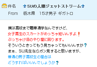 ![]() SU_電話が・・・いや、無線がつながってます! RYO-Z_CQCQ? (笑) もしもし? ギガトロ_もしもし! RYO-Z_RIP SLYMEのRYO-Zです! SU_機長のSUです。 ギガトロ_栃木県のギガトロです! SU_まースカートは見れないよね〜。 ギガトロ_自分は足フェチなんで、余計に (笑) SU_なるほど。あれ? ギガトロって中学生? ギガトロ_高校1年です。 SU_そっか。タメの子たちのスカートも短いんだ? ギガトロ_短いですね。 RYO-Z_足のどこが好きなんだろう? ギガトロ_太ももからふくらはぎにかけてが・・・ RYO-Z_その部分をフォーカスするからダメなんですよ。 ギガトロ_あぁ・・・ RYO-Z_見るなとは言わないから・・・全体を見て。 ギガトロ_・・・全体ですか? RYO-Z_「木」を見るんじゃなくて「森」を見て。 SU_にゃはははは (笑) 全体をポヤーっと見ると? RYO-Z_何か見てるね、って感じになるけど (笑) ギガトロ_そうっすよね。 RYO-Z_だから、全体を見る訓練と、 ギガトロ_はい。 RYO-Z_チラっと見る訓練をね。 ギガトロ_はい (笑) RYO-Z_この2つを頑張ってみてください! ギガトロ_分かりました! (笑) ![]() 「 (SU) オレなんて、"実は見てた"って、誰にも気づかれないからね。進化するとだんだん目が細くなってくから、水泳選手の指と指の間に水かきができるようにね (笑) 。FUMIYAの目が細いのも、そういうのを見るために進化したからなの」 ![]() 「 (RYO-Z) 僕も胸元がすごく開いてる服を着てる人がいると目線がいっちゃいますよ。そういうときは全体を見るようにしてます。目がいっちゃうのは男として、正常ですからしょうがない!」 ![]() 「 (RYO-Z) SU機長、すいません!副機長なのに、さっきはつい、僕が話しすぎちゃいました。次はSU機長にお任せします!」