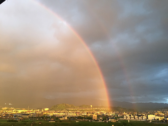 日が沈む時に急に雨が降り出してきて、突然現れた2本の虹です!虹を見ると少年になった気分になります!