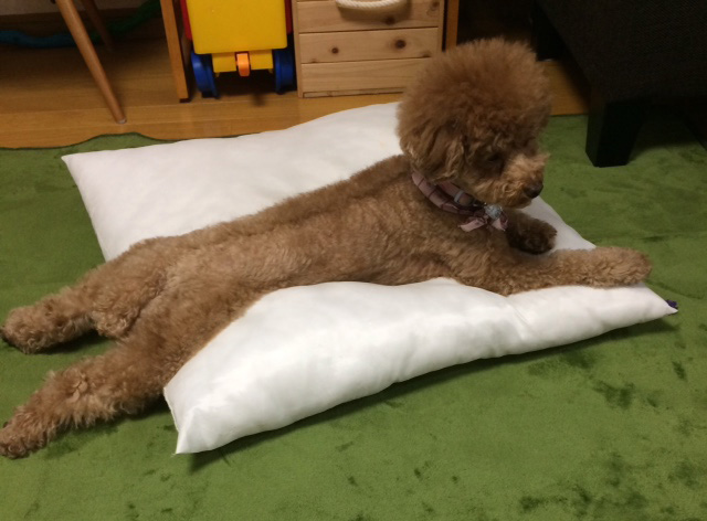 愛犬が、足をぶらーんと伸ばして、まったりしている様子!