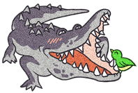「イノシシ」「サル」「スイギュウ」「ウマ」など、大きなお肉が大好きなこのワニ。獲物をみつけると、60本以上もあるするどい歯で、がぶりと一気にいただく。