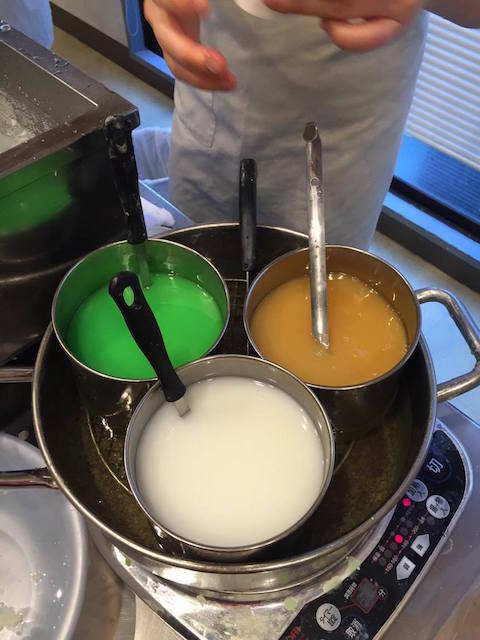 今回、海老や野菜の具の部分がすでに出来上がったものを使用。生徒が行うのは、衣をつける作業です。この食品サンプルの材料になるのが、蝋。今回は天ぷら用に、とき玉子のような色の黄色の蝋と、レタス用に白と緑の蝋を使いました。蝋の温度は、湯煎で約60度にキープ。これを40度のお湯の中に落とし、形を作りながら固めていき、最後に冷たい水でしっかりと固めます。ちなみに、蝋を使ったこちらのやり方は、30年以上前の昔ながらのスタイル。今は型取りをして、樹脂で作る方法が一般的なんだそうです。