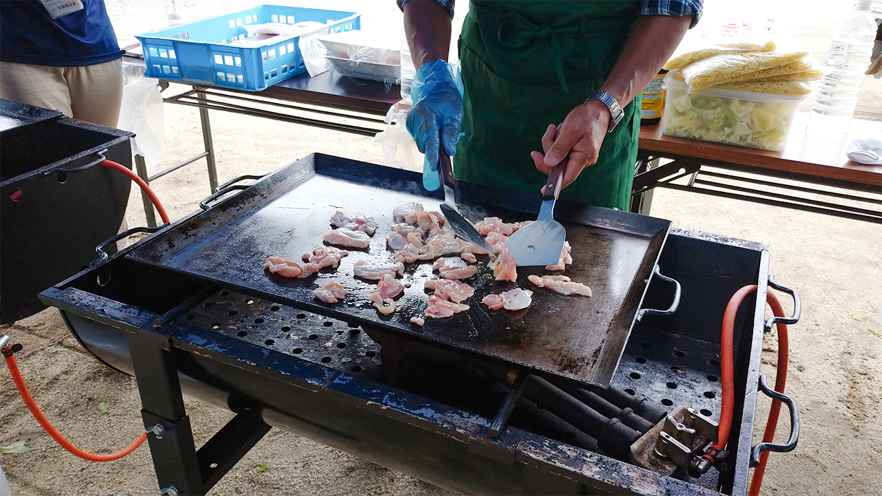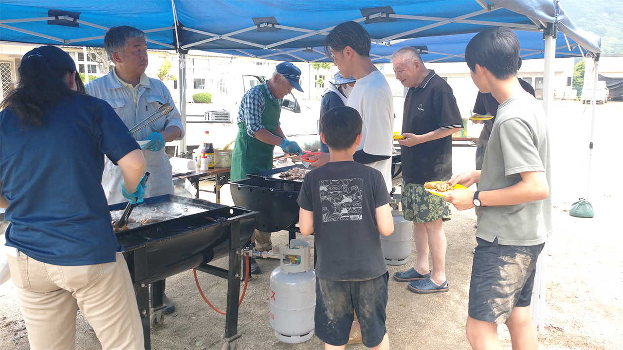 地元食材タップリのバーベキューとツヤツヤ白米のおむすび。