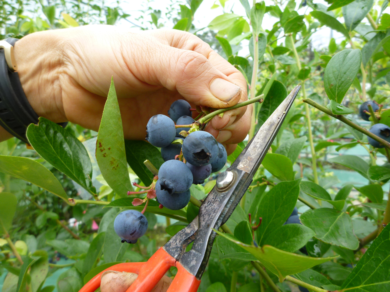 「ブルーベリーは房状に果実がつきますが、房の中でばらばらに熟すので、一粒ずつ摘み取る必要があり、