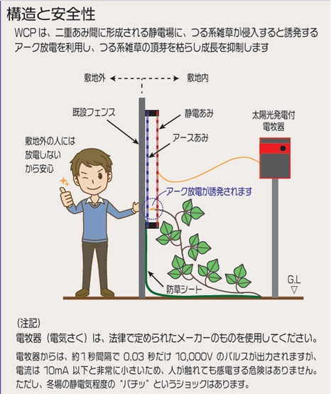 「クズやカズラなど蔓(つる)性の雑草が、芽を伸ばして、金網の間に入ると、芽に放電が誘発されます」