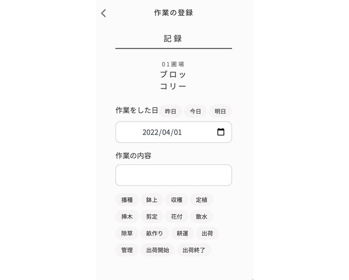このアプリでは、農作業に必要な栽培記録や農薬の情報、売上の管理などが簡単に記録可能。