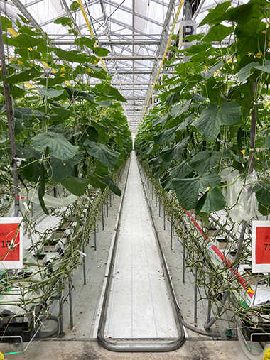 1haもの栽培施設一面に広がるキュウリの列、列、列…。