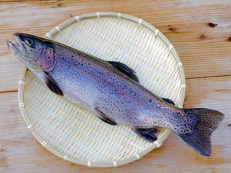 身を赤くするエサを与えないので、白っぽい身が特徴。加熱すると、ふっくら柔らかくジューシーです。