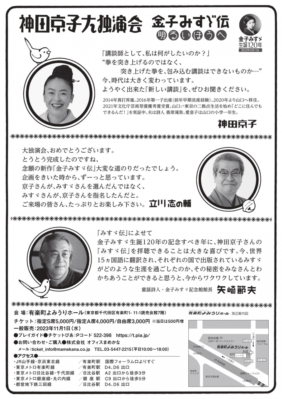 「神田京子大独演会、金子みすゞ伝~明るいほうへ~」、