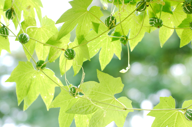 あまり聞き慣れない植物ですが、最近はグリーンカーテン用として需要が高まり、プラントショップやホームセンターでも取扱いが増えてきています。緑に白いスジが入った2〜3cmほどの小さなスイカのような実がなり、最後は赤く染まり、目にも楽しいグリーンカーテンです。ただし、実には毒があるので食べることはできませんので注意が必要です。