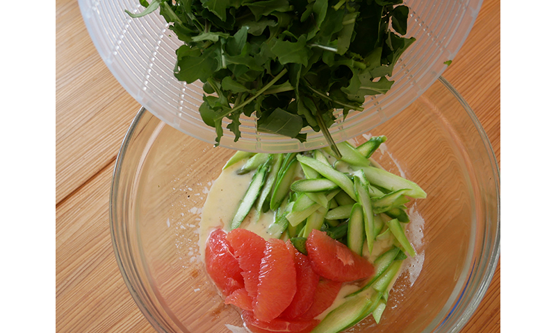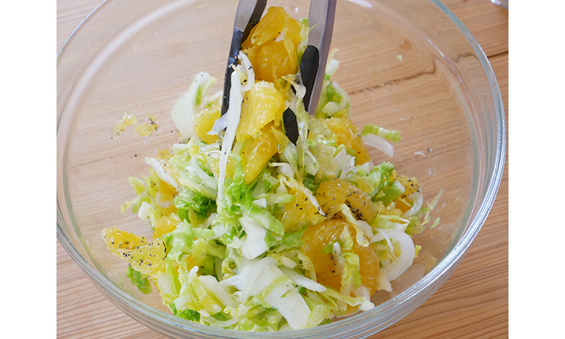 代表的な冬野菜であるカブは、ビタミンCやカリウムが豊富で、消化酵素のアミラーゼも多く含んでおり、胃もたれや食欲不振を防ぐ効果があるといわれています。葉の部分も、ビタミンA、C、E、カルシウムやミネラルが含まれています。カブはアクが少ないので、下ゆでする必要もなく、そのまま調理できますので、簡単サラダとして楽しめます。