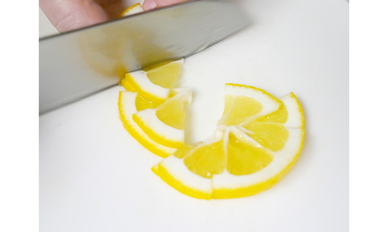 1. さつまいもは1cmの輪切りにし、水にさらしてあくを抜いておく。レモンは5mm幅で3枚輪切りにし、残りは絞っておく。