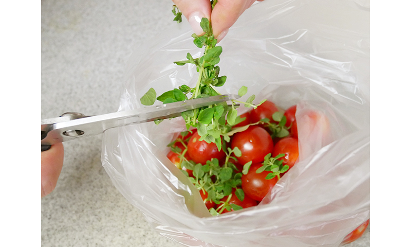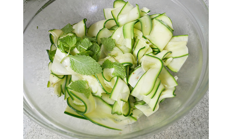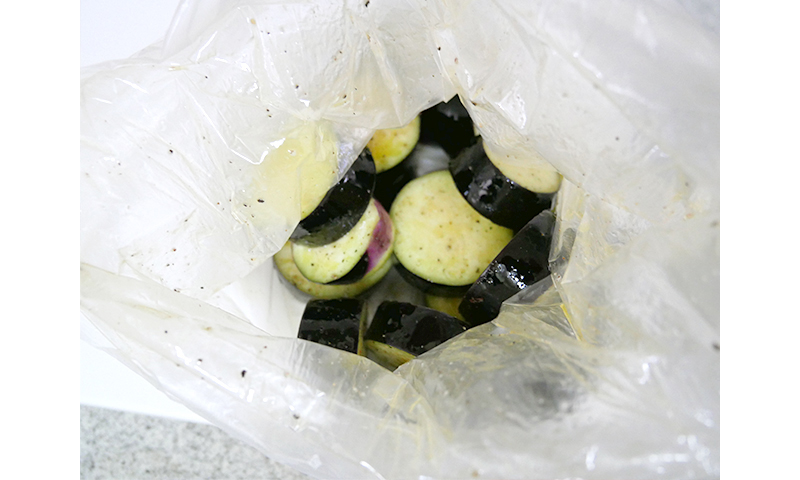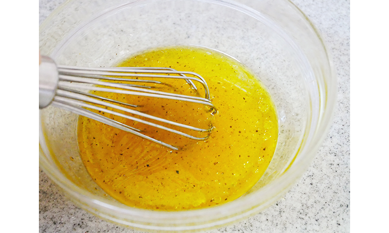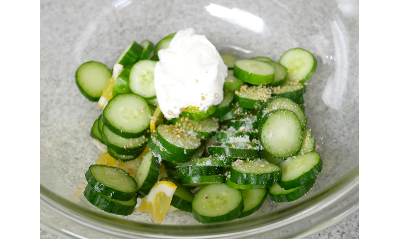 1. カブは皮をきれいに洗い、スライサーなどで薄い輪切りに。茎は大さじ2程度の量に刻んでおく。ライムは2枚程度スライスして8分の1ぐらいに切り分ける。オリーブは輪切りにする。