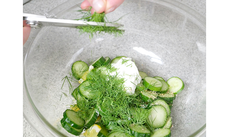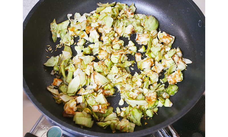 3. 薄くスライスしたカブと刻んだカブの葉を入れてざっくりと混ぜる。