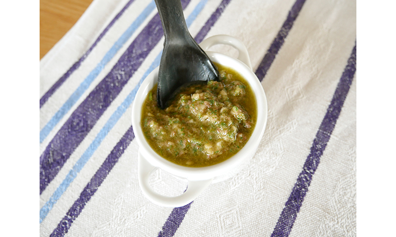 2. ボウルにちぎったアンチョビ、オリーブとオリーブオイルを入れ、スライスしたライムと残りを絞って混ぜる。