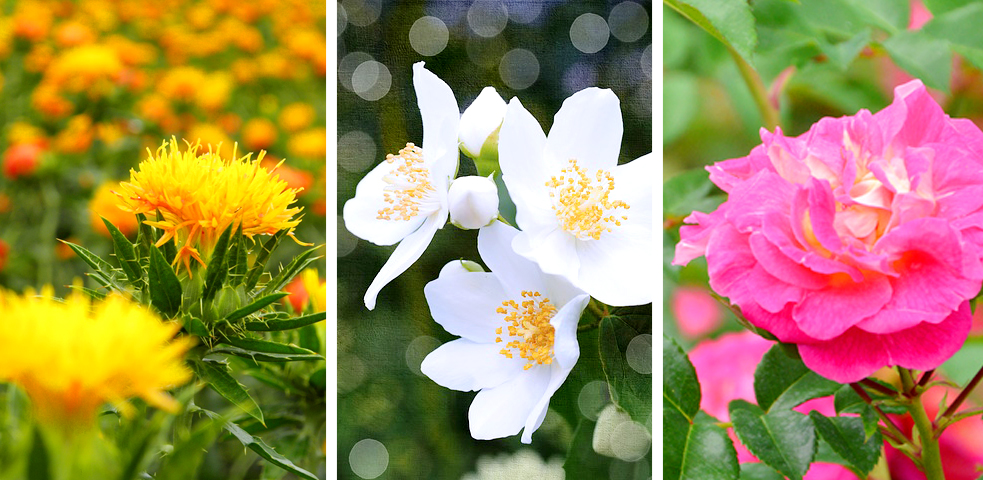 (左: 紅花/中央: ジャスミン/右: バラ)