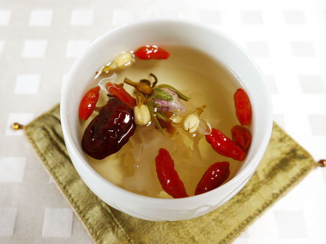 材料が多くて一見ハードルが高く見えますが、その中身は“究極”の女子のための飲みもの。リュウガンやナツメは血を補い、ジャスミンは胃腸の調子を整えます。白キクラゲやバラ(マイマイカ)は肌へ潤いをもたらし、クコにはアンチエイジング効果があるとされています。ほんのりとした甘さでデザート代わりにもなりますね。材料を揃えてしまえば、作り方は簡単なので、試してみてはいかがでしょう。