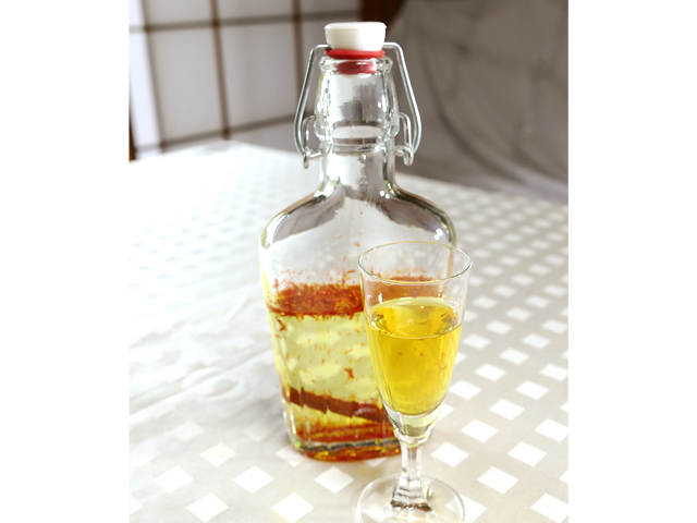 紅花とシナモンスティックと白ラムをミニデキャンタで合わせて1時間ほど漬けた「オレンジ色のお酒」は甘みのあるラムとシナモンのスパイシーさが絶妙。温める効果が絶大なので、気温が下がる季節に頼りになる1杯になりそうです。少量のお酒は食欲を促す効果もあるので、食前酒にもぴったりです。
