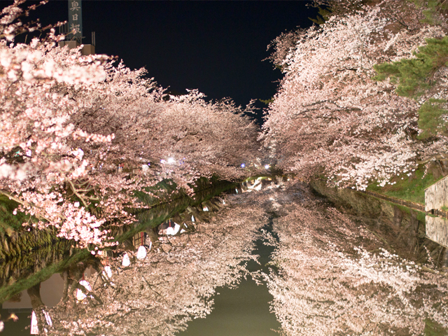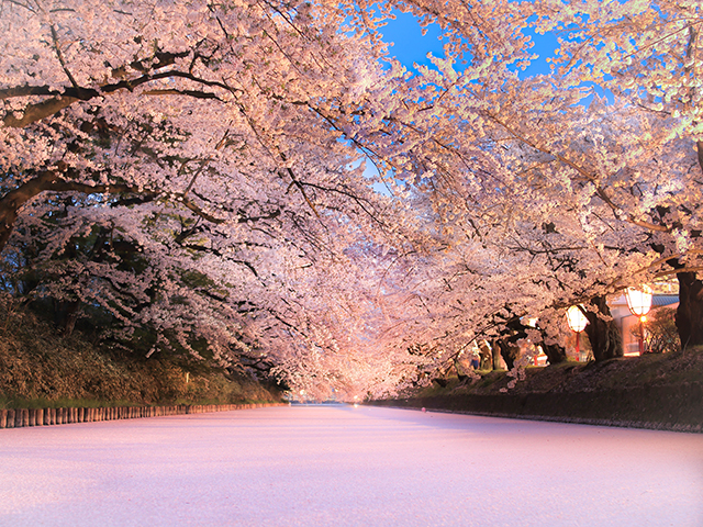 由緒ある桜を守る人を、敬意を込めて呼ぶ言葉として生まれた「桜守」。彼らは桜の木を守り、同時に桜の花が生みだす景観にも心を砕きます。花が一挙に咲き、一挙に散ることで、無数の花びらが鏡のようにお城のお堀一面を覆って生まれる「花筏」は、弘前公園ならではの景色の一つ。 また、お堀に垂れ下がった独特の桜の枝の姿は、豪雪地帯だからこその雪の重みで枝がしなり出来上がったもの。 その分、枝や幹の状態に気を使い出来上がった景観です。