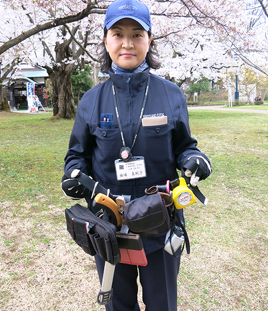 弘前市民に長く愛されてきた大切な桜、この桜を代々守ってきたのが「桜守」の存在です。弘前市役所緑地公園課に務める橋場真紀子さんは、2006年に樹木医の資格を取り、2014年に念願の「桜守」となります。仕事の大半を占めるのが園内の桜などの木の状態を「見る」こと。桜の開花の季節が近づくと、たっぷり毎朝2時間以上をかけて園内を見回り、木の状態を観察します。それは「見る」というより「診る」という作業。枝や幹は雨や雪、風などに曝されるうえに、最近では、酸性雨や排気ガス、桜の木の回りを囲むコンクリートの影響など、木を衰弱させる環境が増えているそうです。枝や幹はもちろん、根の状態、 花の咲き方、花の数、そして、落ち葉の状況まで気を配り、痛んだ木は手当をしてゆきます。 手当の七つ道具は「剪定鋏」「鋸」そして、「双眼鏡」、「樹木用の薬液・消毒液」など。常時携帯して大掛かりなもの以外は、自分の手で処置をします。