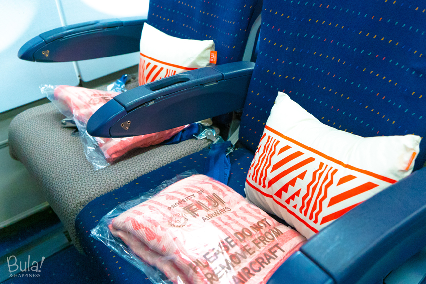 ブランケットとクッションはフィジー伝統のタパ柄のピンクで統一されているのがとっても可愛く、飛行機の中から舌も見た目もフィジーモードへ!
