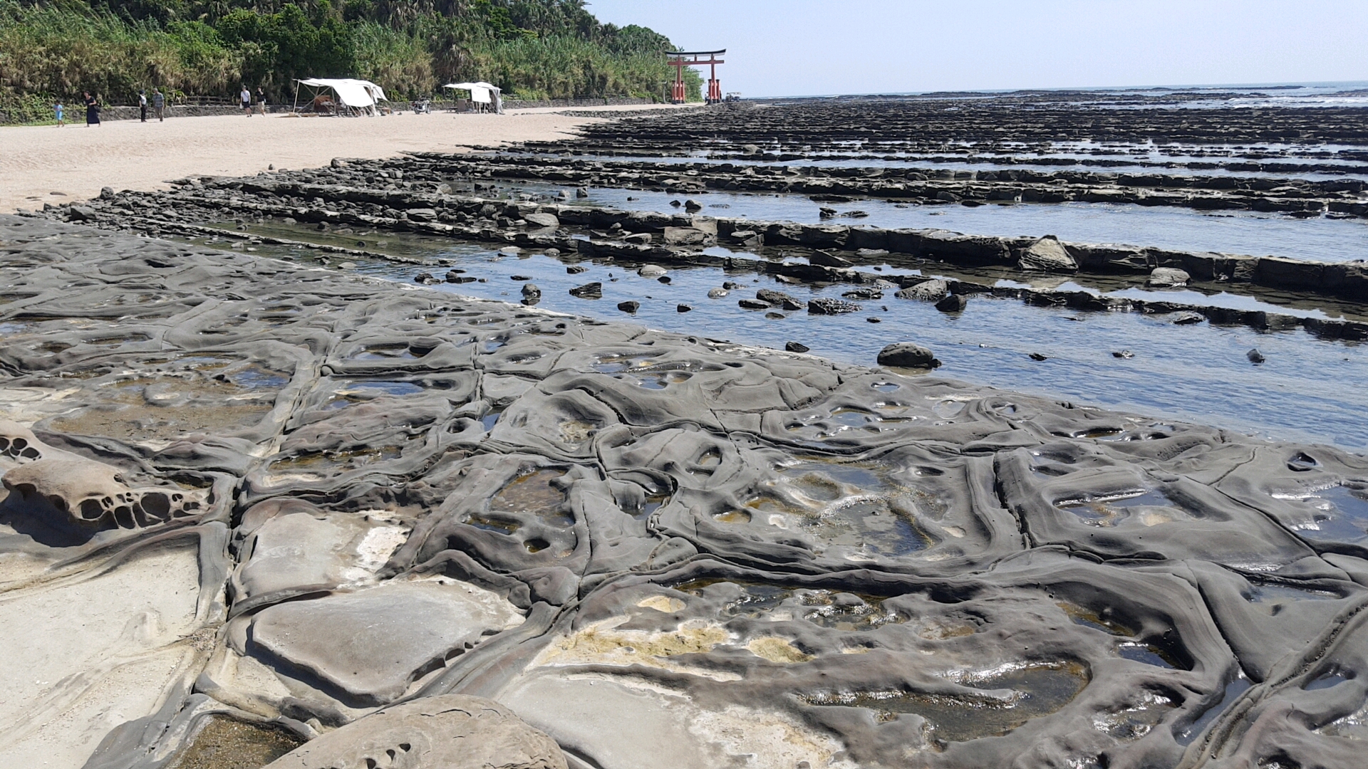 南国情緒漂うフェニックスの並木を車窓から眺めていると、空港あたりの道路で埴輪がお出迎えしてくれます。そして、空港を過ぎて、JR日南線沿いを走る日南海岸ロードパークを南へ約30分行くと、宮崎を代表する小さな島“青島”が見えてきました。青島は、亜熱帯性の木々に覆われ、海岸と弥生橋と呼ばれる橋一本で結ばれた島。南国情緒と神秘的な雰囲気が漂うこの島は、海幸彦、山幸彦の神話の舞台になっています。そして島全体を覆う岩盤は、波の形をしていることから「鬼の洗濯板」と呼ばれています。干潮時は洗濯板の上を歩くこともでき、自然が作り出した凸凹の巨大アートを間近に体感できます。