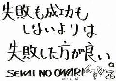 SEKAI NO OWARIさん、楽しかったですね。どうしてもLOVEさんが面白くて面白くてですね、LOVEさんばっかり見てしまいました。皆さんに質問すると、全員がピクッとして、LOVEさんも一緒にピクッとするして、あとハニカム感じとか、目と口が見えるんで、ハニカンでるんだな、とかずっと見ちゃって、可愛かったですね。ゲストにお迎えしてお話したのは短い時間ですけど、なんか朴訥な良い方なんだろうなと思いました。