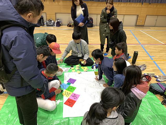 フィールドワークから体育館に戻り、早速『安全マップ』作りに挑戦です。